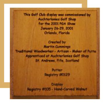 Wanting to combine his love of golf with his amateur woodworking skills, Martin was determined that he would make replica golf clubs from the era when clubs were made from wood. So, he began to look for an old-world golf shop that still produced all-wood clubs but was unable to find one in the U.S. His search finally led him to Auchterlonies of St. Andrews, makers of fine golf clubs since 1895. You can read more about that quest on our Tribute to Auchterlonies page.